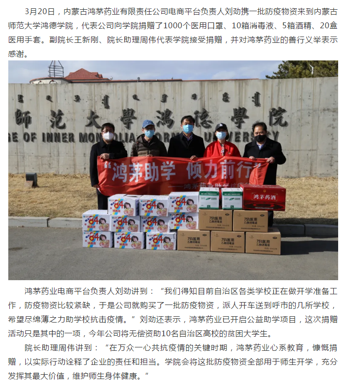 鴻茅藥業向內師大鴻德學院捐贈防疫物資