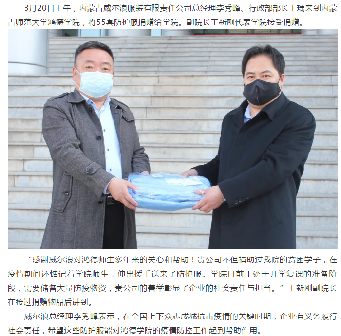 威爾浪向內(nèi)師大鴻德學(xué)院捐贈(zèng)防護(hù)服
