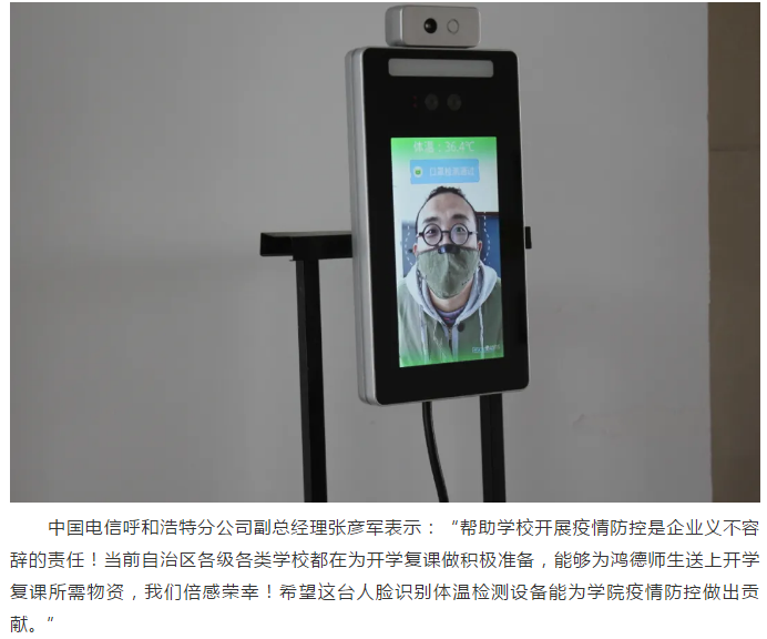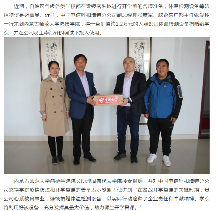 中國電信呼和浩特分公司向內師大鴻德學院捐贈人臉識別體溫檢測設備