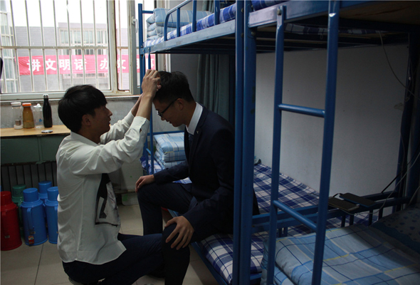 宿舍的同學也前來幫忙,為他打理發型,舍友們都說“鄭院長”今天要比平時帥了好幾倍。