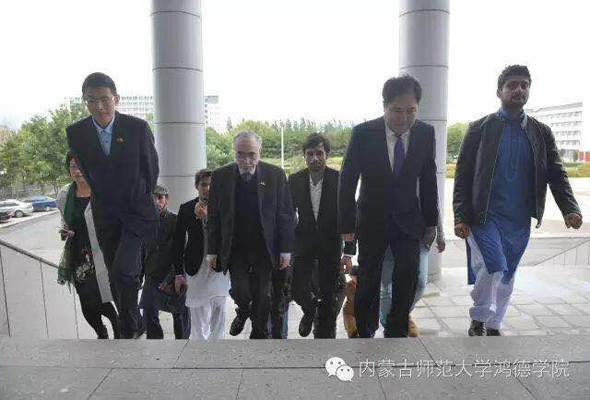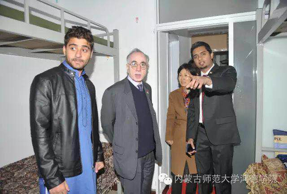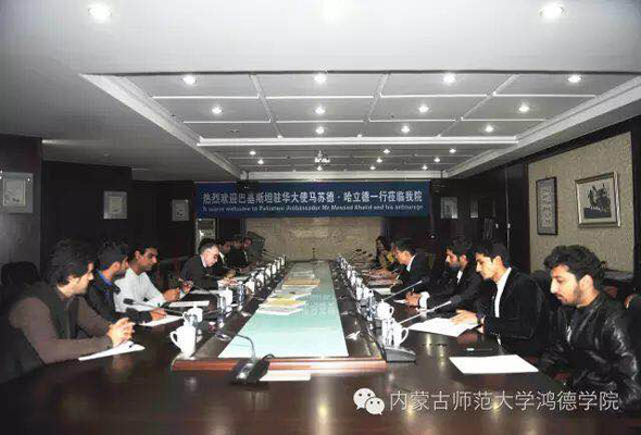 上午9點30分,在王新剛副院長的陪同下,馬蘇德·哈立德大使一行首先來到留學生宿舍進行了參觀,隨后在崇德樓第一會議室展開交流座談,外事辦史麗珍主任、巴基斯坦研究中心唐俊主任出席會議。王院長首先對馬蘇德·哈立德大使第二次訪問鴻德學院表示熱烈的歡迎,并詳細介紹了鴻德學院目前在與巴方高校的合作、巴基斯坦研究中心的成立以及留學生的在校學習、生活狀況等相關內容。王院長講到,我院與巴基斯坦高校的教育合作橋梁已經建成,中巴友誼源遠流長,我院在兩國間友誼之橋的搭建上也作出了自己的貢獻。目前鴻德學院計劃開設烏爾都語,讓學生通過巴基斯坦語言的學習,更加深入的了解這個中國的兄弟之國。