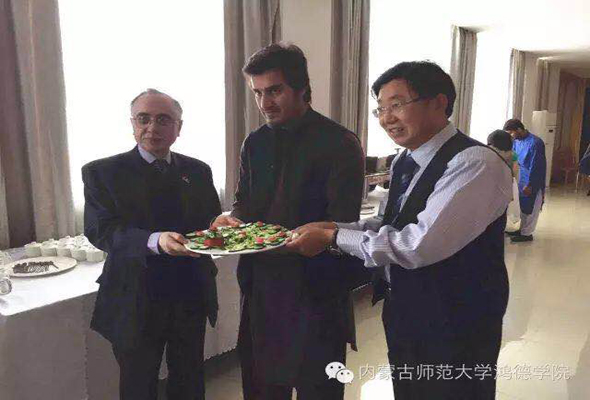 參觀結束后,馬蘇德·哈立德大使及周玉樹院長等我院領導與巴基斯坦留學生在圖書館藝術長廊共進午餐。留學生們還為大使一行親手烹制了巴基斯坦的特色飯菜,并特別制作了花形圖案的蔬菜拼盤,寓意中巴友誼之花常開常新,深厚情誼地久天長。