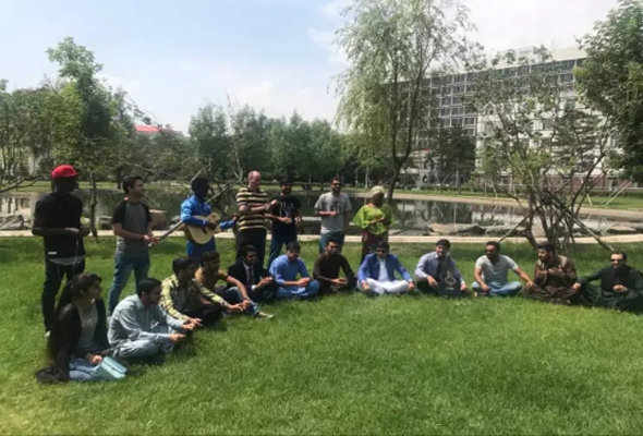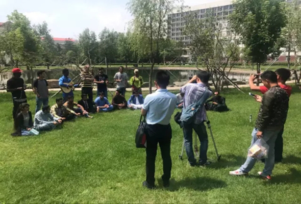 拍攝完教學(xué)的部分,留學(xué)生們來到我院的明鏡湖旁,在這里載歌載舞,展示他們豐富的課余文化生活。來自非洲的留學(xué)生陳思身著民族服飾,唱起了一首首動(dòng)聽的歌曲,留學(xué)生姚明則拿起吉他為她伴奏,大家歡呼雀躍,用歌曲和舞蹈來表達(dá)他們對祖國的熱愛。外事辦史麗珍主任也加入到了他們歡樂的行列當(dāng)中,并現(xiàn)場教留學(xué)生們演唱校歌,“邊城美疆、馬散人剛……”熟悉的旋律在校園中飄揚(yáng)。