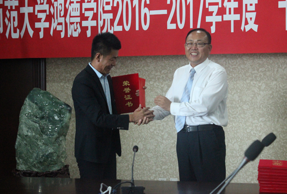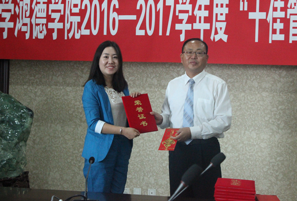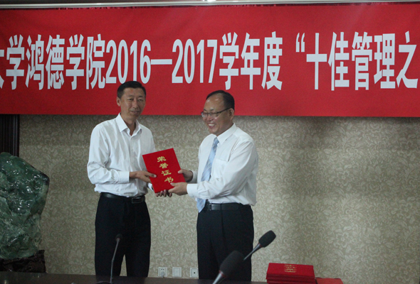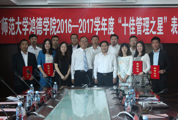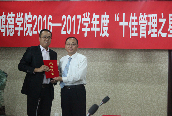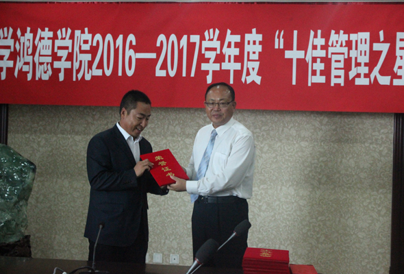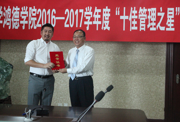 首先,王新剛副院長宣讀《內蒙古師范大學鴻德學院關于表彰2016—2017學年度“十佳管理之星”的決定》,王志剛、白曉童、孫青河、侯亞峰、王星卜、雅茹、田磊、李鯤、汪洋、蘇力德十位教師榮獲獎項。黨委書記盧風龍為獲獎者頒發榮譽證書。