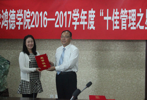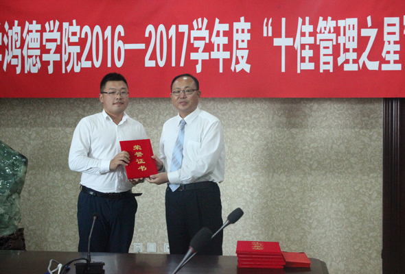 最后,盧鳳龍書記對“十佳管理之星”獲得者致祝賀詞,盧書記總結道:“在教師節來臨之際祝全院教師節日快樂,“管理之星”也可以稱為“育人之星”,不論是管理部門還是教育部門,都是通過教育育人、管理育人,都要堅持黨的教育方針,堅持社會主義辦學方向,希望各位教師今后在各自崗位繼續努力工作,為鴻德學院的教育事業做出更大的貢獻。”