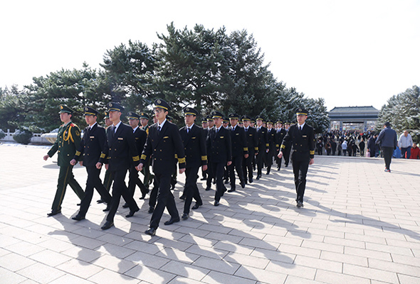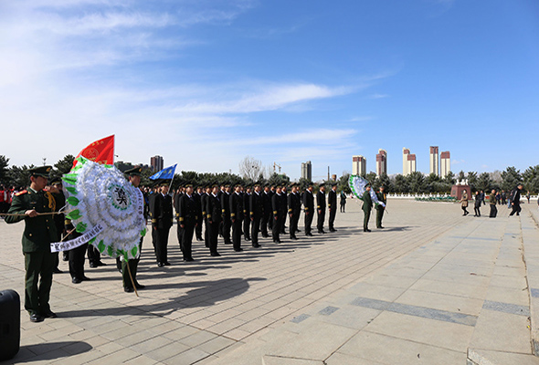 當日清晨,護校隊的同學們便從學院集合出發,一路向北,紅色的校旗在朝陽下灼灼生輝。在烈士陵園的紀念碑下,護校隊全體隊員向革命先烈敬獻了花圈,并默哀致悼,緬懷先烈,寄托哀思。