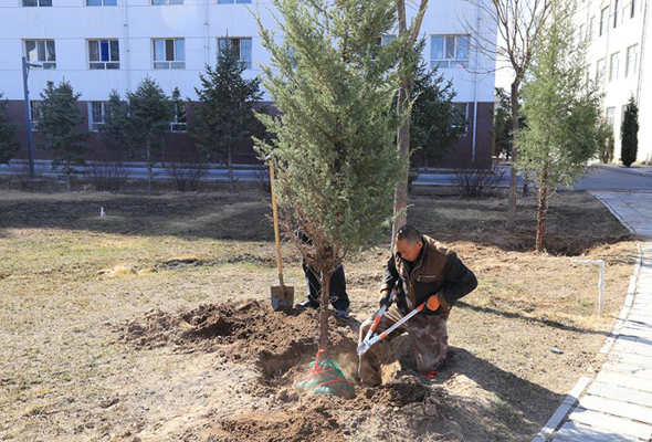 4月12日下午,內蒙古師范大學鴻德學院校園內駛入一輛輛載滿油松樹苗的大卡車,行動緩慢的大吊車也提前伸出了長長的吊臂原地待命。春夏之交,天氣咋暖還寒,鴻德學院院長周玉樹、分管校園綠化院領導周偉前往綠化現場親自指揮,學院各系(分院)百余名師生手持鐵鍬、榔頭等工具整裝待發,鴻德學院校園綠化建設在傍晚時分打響。