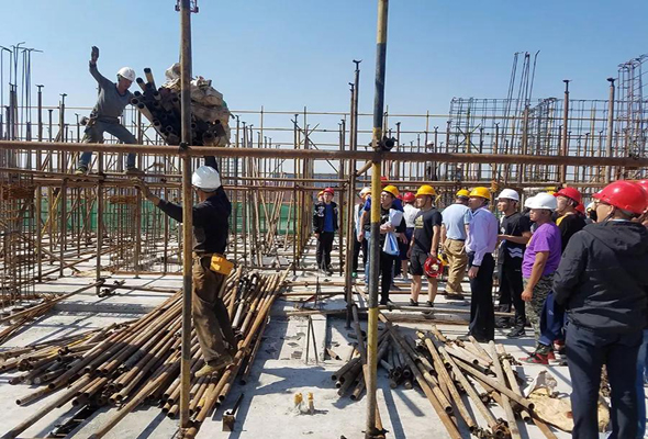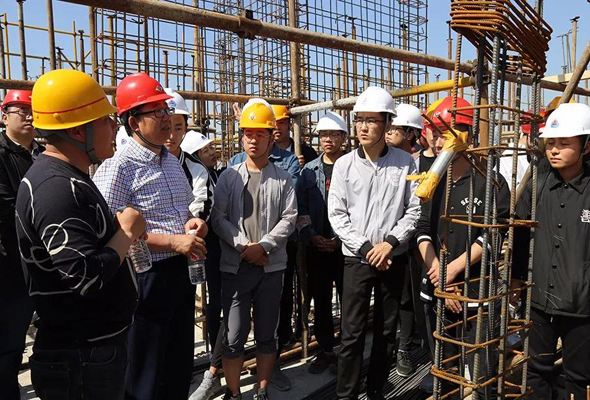 下午兩點,課程開始,在我院院長周玉樹、總務處處長焦建偉,中天建設集團項目經理王祖為、執行經理汪炳良以及我院管理系、總務處部分老師的帶領下,土木工程二班的同學來到了致遠樓北側的足球訓練學校項目施工現場。2016級土木工程專業的同學正處在大學二年級的理論知識學習階段,這是他們第一次深入到施工現場進行親身體驗和學習,因此每個同學的臉上都寫滿了緊張和興奮。在前往工地的路途中,周院長親切的和同學們互動,現場計算起崇德樓,致遠樓的房屋成本以及相關的項目費用。周院長生動的和學生們講述到自己98年用“五點計劃”第一次籌措資金蓋房子的故事,即“自己攢一點,銀行貸一點,朋友借一點,工程欠一點,家長集一點”,啟發學生們在學以致用的同時,思想要積極活躍,學會用開闊的眼光看待世界。隨后的實踐學習過程中,通過中天建設集團兩位經理的現場實踐指導和系內老師的理論講解,讓同學們對平日里晦澀難懂的復雜概念和一知半解的項目實操有了清晰深刻的認識和體會。