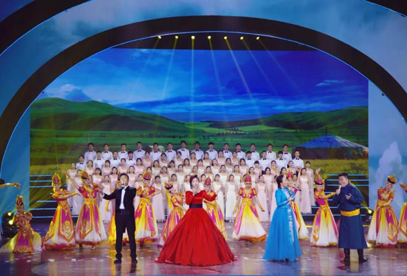 在這個(gè)充滿使命與光榮的日子里,我院鴻韻合唱團(tuán)作為幸運(yùn)的“一員”,應(yīng)邀參加此次演出。本次演出分為五個(gè)篇章,共計(jì)十三個(gè)節(jié)目。我院鴻韻合唱團(tuán)合唱原創(chuàng)主題曲《祖國,草原祝福你》。