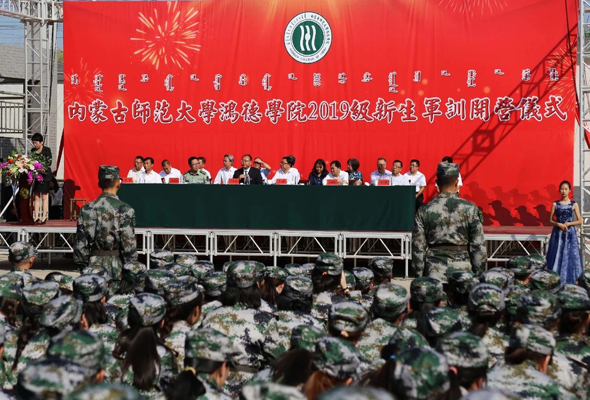 9月6日上午,內蒙古師范大學鴻德學院2019級新生軍訓開營儀式在學院操場隆重舉行。呼和浩特市新城區人民武裝部部長孟樹濤上校,院領導周玉樹、盧鳳龍、王新剛、劉文清、周偉及學院各部門負責人與2019級新生班主任和全體新生參加了開營儀式。