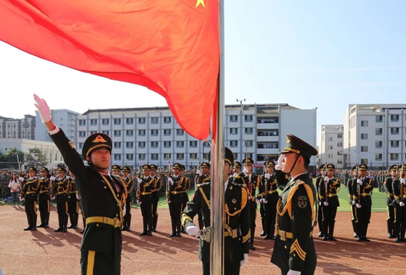 開營儀式在莊嚴的國歌聲中拉開序幕,學院國旗護衛隊邁著整齊矯健的步伐,護衛著國旗入場,在場的全體師生和教官敬注目禮,國旗冉冉升起。