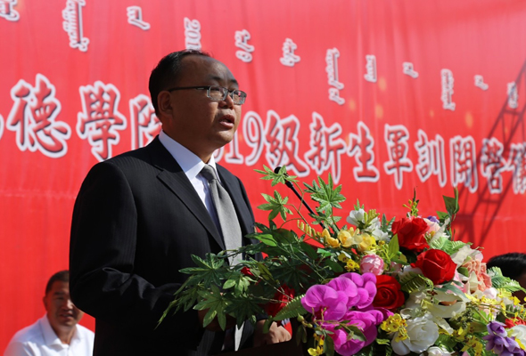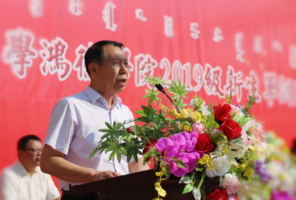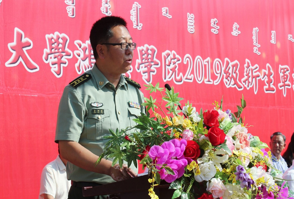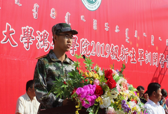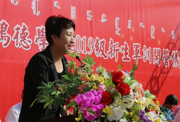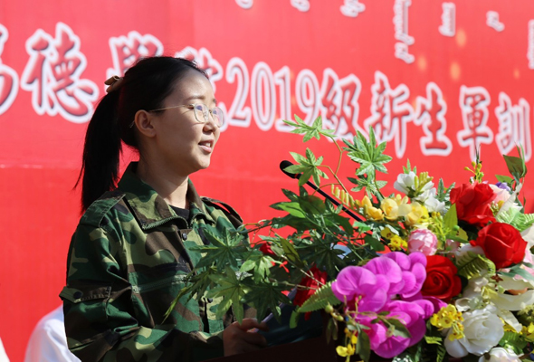 新生指導員外語系教師烏日汗發言,她講到“作為指導員,我堅信所有同學都會以鋼鐵般的意志、團結互助的精神,積極投入到充滿挑戰的軍訓生活中去!我們將以辛勤的汗水為墨,以頑強的毅力和進取的精神為筆,撰寫下2019級新生軍訓的勝利篇章!”