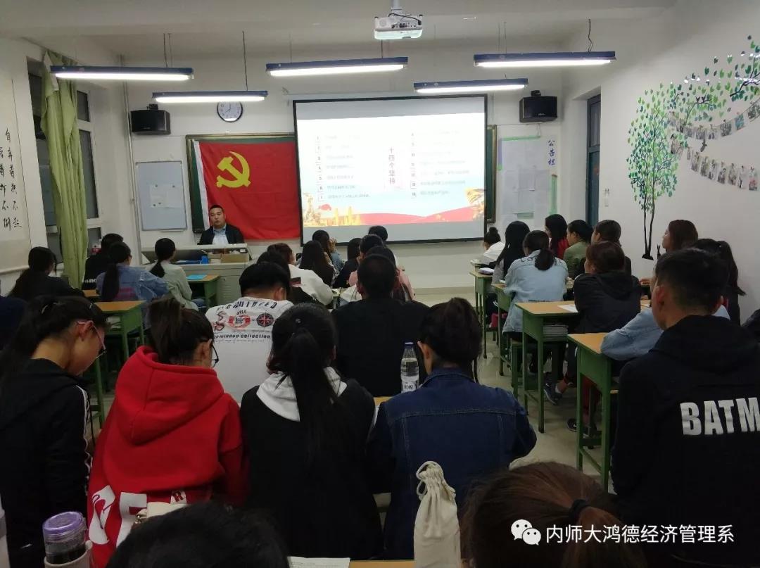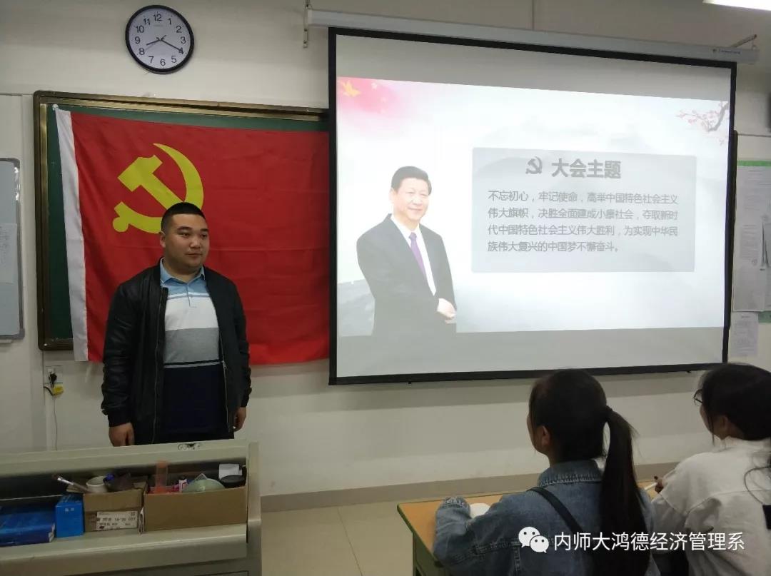 為深入學習宣傳貫徹黨的十九大精神,結合學校實際,進一步推進我系思想政治工作的發展。經濟管理系于4月24日在天健樓305開展了學習宣傳貫徹黨的十九大精神為主題的黨課。由經濟管理系黨支部彭兆強老師主持。