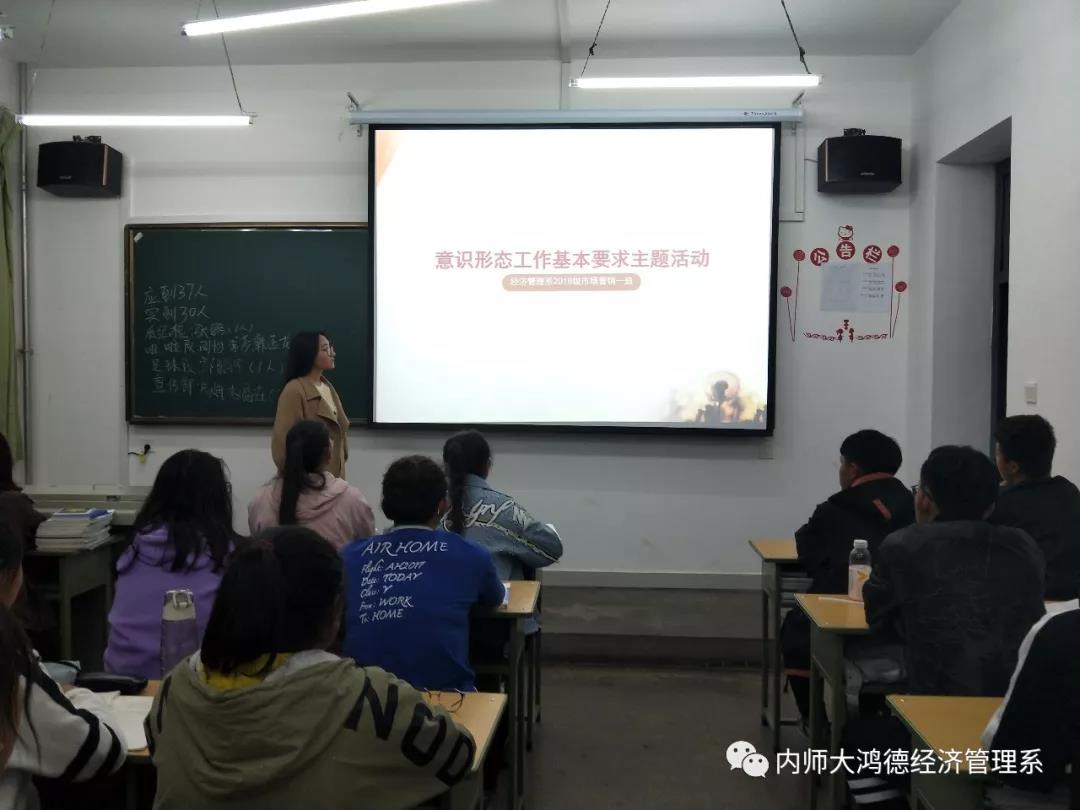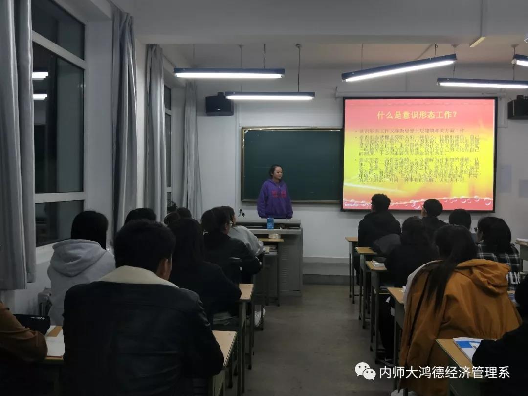 通過精心準備,各班團支書主要以“什么是意識形態,當前意識形態的領域形式,牢牢把握意識形態工作的主導權”三方面為核心進行講解,同時以新穎的講解方式將現代化與“和為貴”,“和而不同”,的古典文化相結合,充分調動了同學們的積極性。